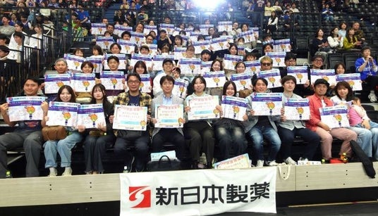 新日本製薬 株式会社(本社:福岡市、代表取締役社長CEO:後藤孝洋)は、2026年4月18日(土)に行われたライジングゼファーフクオカの横浜エクセレンス戦へ、福利厚生の一環として社員とそのご家族・ご友人を招待。2026年度新入社員も参加し、歓迎・交流の場といたしました。当日は「桜とともに勝利の花を咲かせよう!」というテーマで作成したオリジナル応援グッズを配布し、総勢約80名で観戦いたしました。