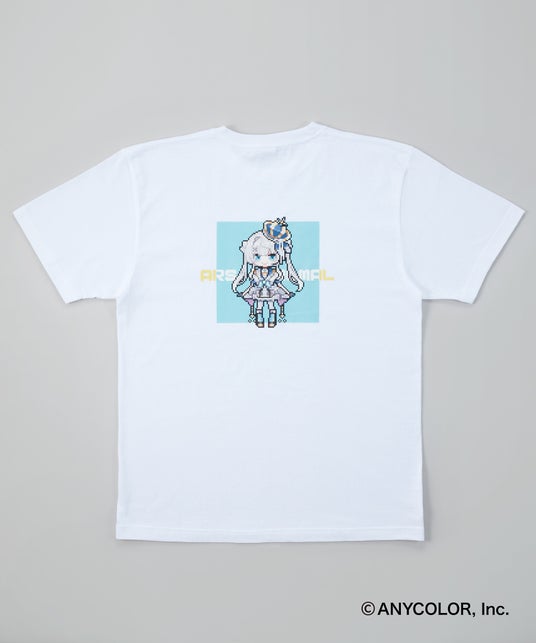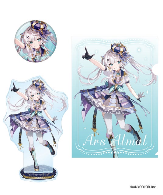 今回販売しているのは、8月25日に「アルス・アルマル 新衣装3D お披露目配信」にて公開された新衣装(※)を着用した「アルス・アルマル」のイラストを使用したアイテム全7型です。イラストレーター・ぶーた氏(@booota)が描き下ろした等身イラストを使用したグッズや、イラストレーター・キュアもと氏(@curemoto_dot)が手がけたドットイラストを使用したアパレルアイテムなどを展開しています。