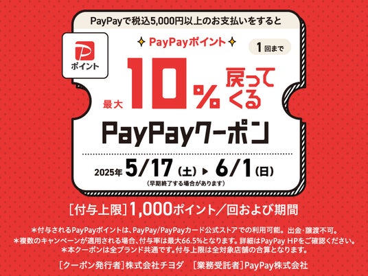 期間中、PayPayで5,000円(税込)以上のお支払いをすると、PayPayポイントが最大10%戻ってくるPayPayクーポンを配信中!