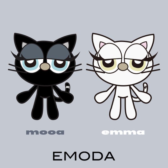 EMODAのブランドコンセプト “モノトーン” がテーマのキャラクター。ブランド名の頭文字 「e」と「m」から名前をつけた、黒猫mooa(モア)と白猫emma(エマ)。ブランド設立15周年の2025年に誕生した2匹の猫の女の子。尻尾にそれぞれのイニシャルがついているのがポイント。