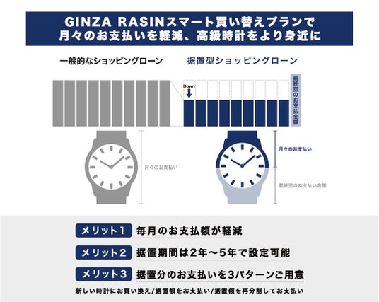 高級時計の購入や買い替えの際、GINZA RASIN 据置型ショッピングローン スマート買い替えプランでお客様ひとりひとりの資金計画やライフプランに合わせてご利用いただくことができます。当社は多くのお客様に最も素敵な時計を選んでいただけるよう、今後も新たなサービスを提供いたします。