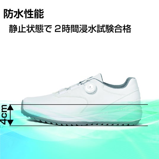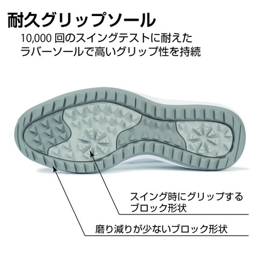 突然の雨や朝露など、ゴルフは天候の影響を受けやすいスポーツです。「耐久グリップゴルフシューズ」は、防水性能※を備えており、足元を常にドライで快適に保ちます。これにより、天候を気にせずプレーに集中できる環境を提供します。