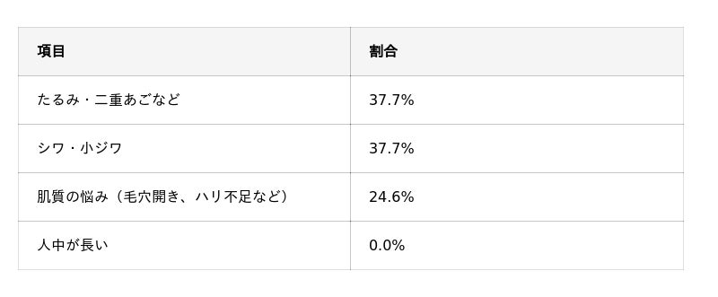 - 施術前に抱えていた悩みを「たるみ・二重あごなど」または「シワ・小ジワ」と答えた人が最も多い