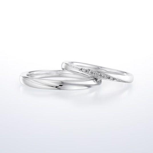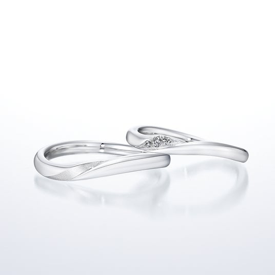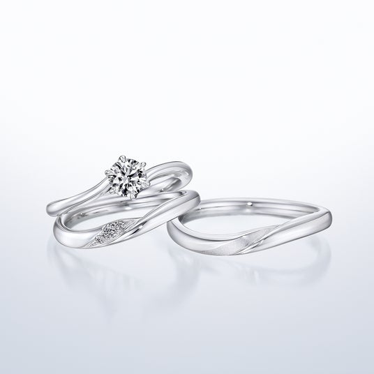 ピュアなダイヤモンドが一層輝くように美しい曲線を描くエンゲージリングと、日常使いしやすいようにメレダイヤモンドがセッティングされたマリッジリング(中央)が隙間なく繋がります。重ねて着けることで増す輝きから、おふたりの幸せの煌めきがどこまでも広がっていく様子を想像させるセットリングです。