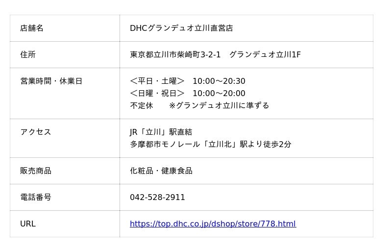 株式会社ディーエイチシー(本社:東京都港区、代表取締役社長:宮崎緑、以下:DHC)は、「DHCグランデュオ立川直営店」を美と健康をトータルサポートする新コンセプトショップへリニューアルし、2025年9月19日(金)に装い新たにOPENします。