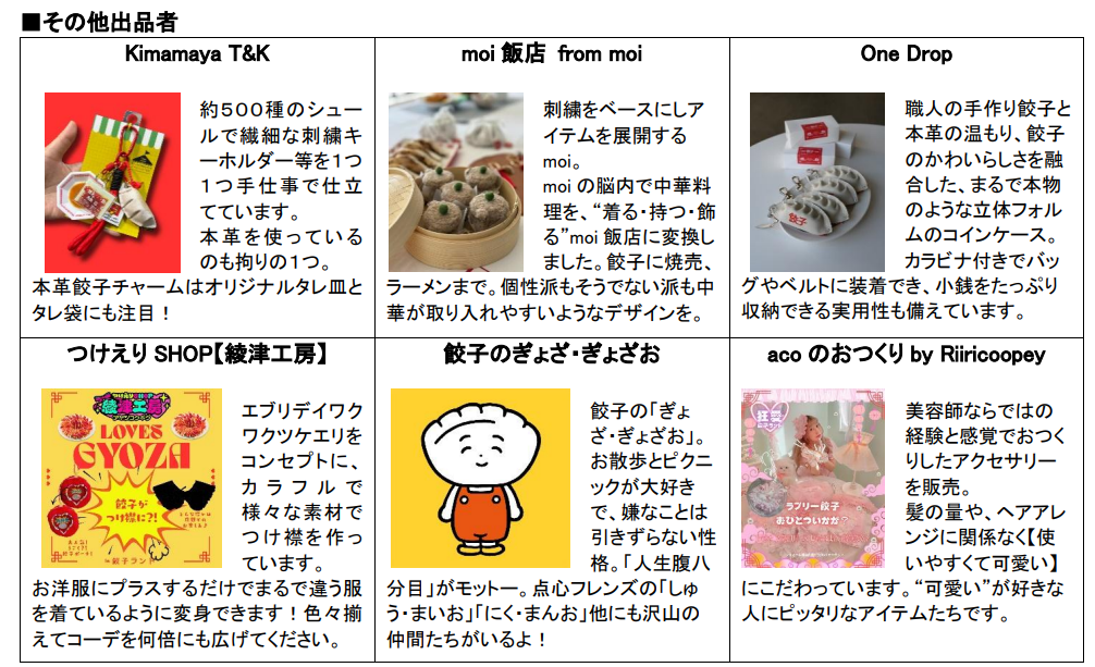 日本の焼き餃子文化を広めることを目的に設立。全国各地で餃子を愛する餃子職人を掘り起こし、餃子愛好家につないでいる。「狂愛!餃子ランド Vol.3」には、餃子にまつわる出品者を多数引き連れて登場。