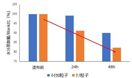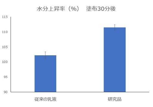 今回の研究品が、目指していた目的を達成できているかどうか確認しました。まずバリア機能については、マイクロサイズの乳液とナノサイズの研究品を肌荒れ直後から48時間後まで比較し水分蒸散量を測定した結果、研究品の方が水分蒸散量を低く抑えられており、高いバリア機能を有することが確認できました。また、保水機能について、塗布30分後に従来の乳液と研究品の比較を行ったところ、研究品の方が保水力が高いことも確認できました。今後も心地よい使用感と効果の両立を叶えられる研究に取り組みたいと考えます。