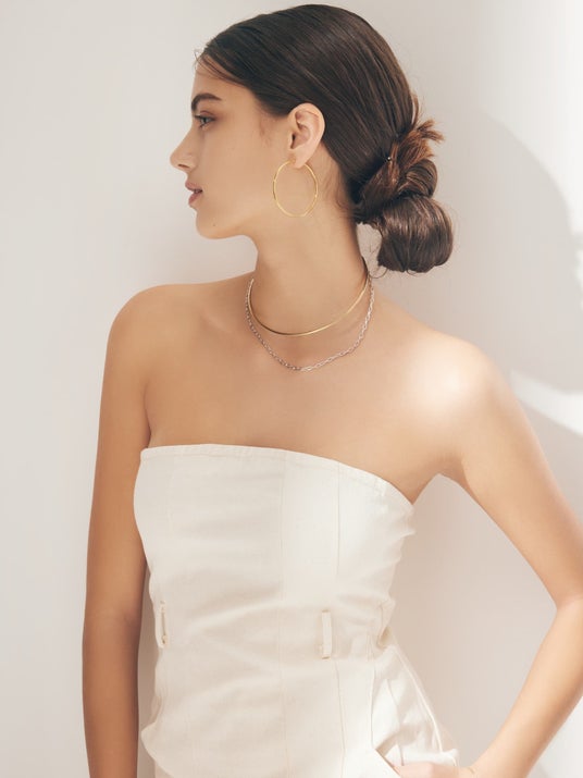 トレンドのメタル感をより楽しめるように、既存のデザインよりもボリュームのあるチョーカーにアップデート。チェーンにもより存在感を持たせ、ゴールドとシルバーのコンビカラーが映えるバランスに仕上げました。合わせるアイテムを選ばず、機能性とデザイン性を兼ね揃えた毎日のコーディネートのベースとなるアイテムです。