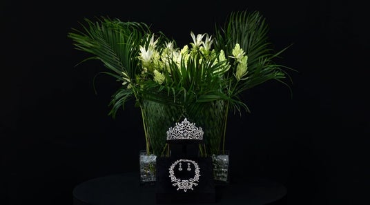 ダニエル・オスト氏が『シャングリラ』コレクションのために制作した作品。さわやかな白と淡いグリーンを帯びた「ノーブルリリー」の花言葉は、純潔・無垢。ウエディングブーケとしても使用される、清楚で上品な雰囲気のユリの花です。2つの花器にいけられたノーブルリリーが対をなし、繊細でありながらもダイナミックさを感じます。ダイヤモンドティアラの輝きと植物がもつ有機的な柔らかさのコントラストや、シンプルで安定感のある構図が静かで洗練された美しさを感じる作品です。