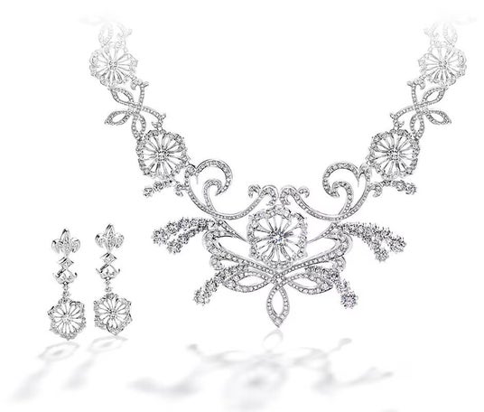 庭園を象徴する花の中央には6ctのダイヤモンド、その上部にはユリの紋章を形どったものにペアシェイプの3ctダイヤモンドが包まれています。