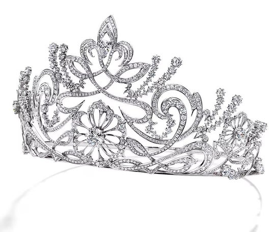 シャングリラとは「理想郷」という意味。ヨーロッパの貴族たちは、自らの想いを込めた理想郷として、庭園を造ります。その美しい庭園で、運命に導かれて出会う恋人たちをイメージしてデザインされたティアラセット、『シャングリラ』。