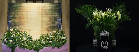日本橋高島屋のメインエントランスに設置された約3mの舞妃蓮のインスタレーション。背景のタペストリーは、染色された和紙で日が昇る様子を表現(左)。ダニエル・オスト氏が「シャングリラ」コレクションのために制作したノーブルリリーを使用した作品(右)。