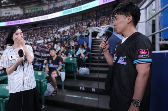 5回裏終了後のイニング間イベント「カップルインタビュー」に登場したゆうきさんとしおりさん。