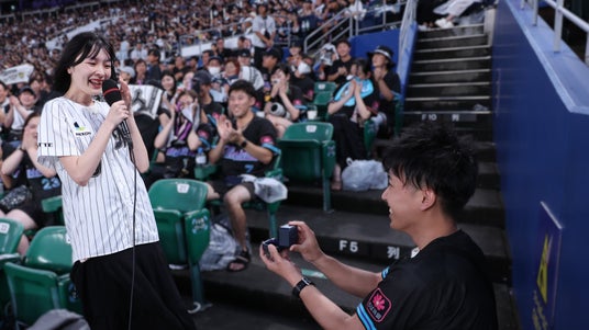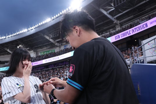 最後にお互いへのメッセージを求められ、しおりさんは「これからも野球を見に行ったり、楽しいことを一緒にしたいです」と笑顔でゆうきさんに視線を向けました。その直後、ゆうきさんの番になると突如球場のBGMがオフになり、一歩前に下がってしおりさんと向き合うゆうきさんの姿が!球場はどよめきに包まれます。