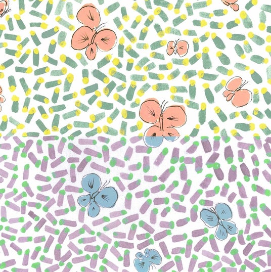 ミナ ペルホネンが手がけた新柄1柄、復刻4柄に、ランドセルの新色「ペールモーブ」「ユーカリ」も加えた全9種類のアトリエシリーズ。2027年ご入学限定のラインアップです。■ butterfly smile 蝶の微笑み【書き下ろし新柄】