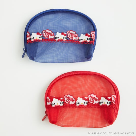 ポーチ / 価格:2,750円「近沢レース店」で定番のメッシュ小物シリーズより、懐かしい70年代をイメージしたハローキティを繊細なレースで表現したミニポーチ。小物類を持っておくのにぴったりなダブルファスナーの仕様で、2か所に分けて収納可能です。ビビッドな赤、青のメッシュと、かわいらしいハローキティの刺繍がアクセントになったアイテムです。