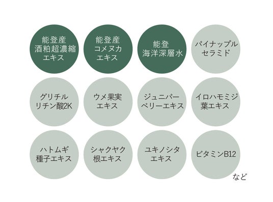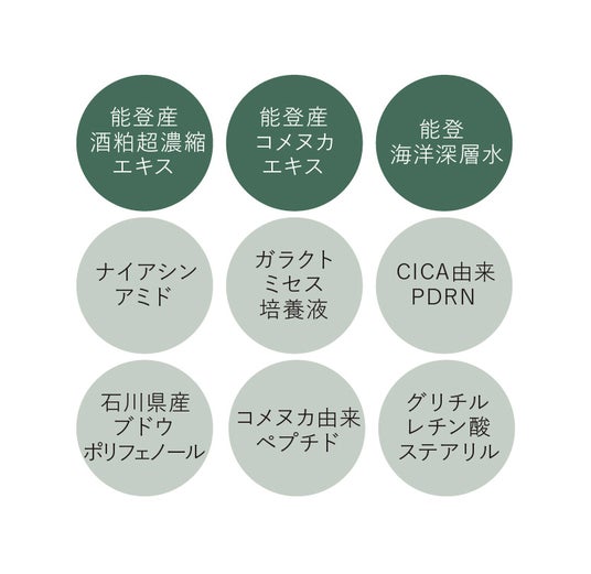 ※能登産熟成酒粕超濃縮エキス:酒粕エキス(保湿成分)※能登産熟成酒粕パウダー:酒粕(保湿成分)※能登産コメヌカエキス:コメヌカエキス(皮膚柔軟成分)