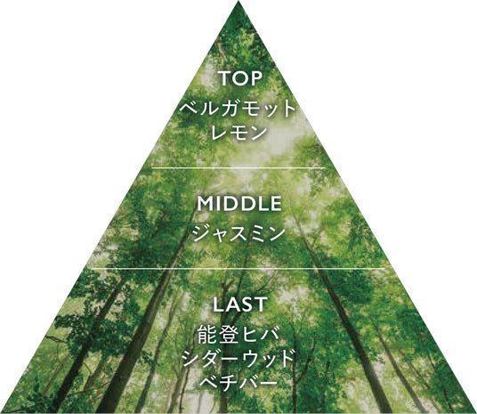 木漏れ日がきらめく能登の森の情景をイメージした明るさと落ち着きを兼ね備えた香り。独自開発の能登ヒバ精油を中心に、ベルガモットやジャスミン、シダーウッド、ベチバーなどの精油をブレンドしました。