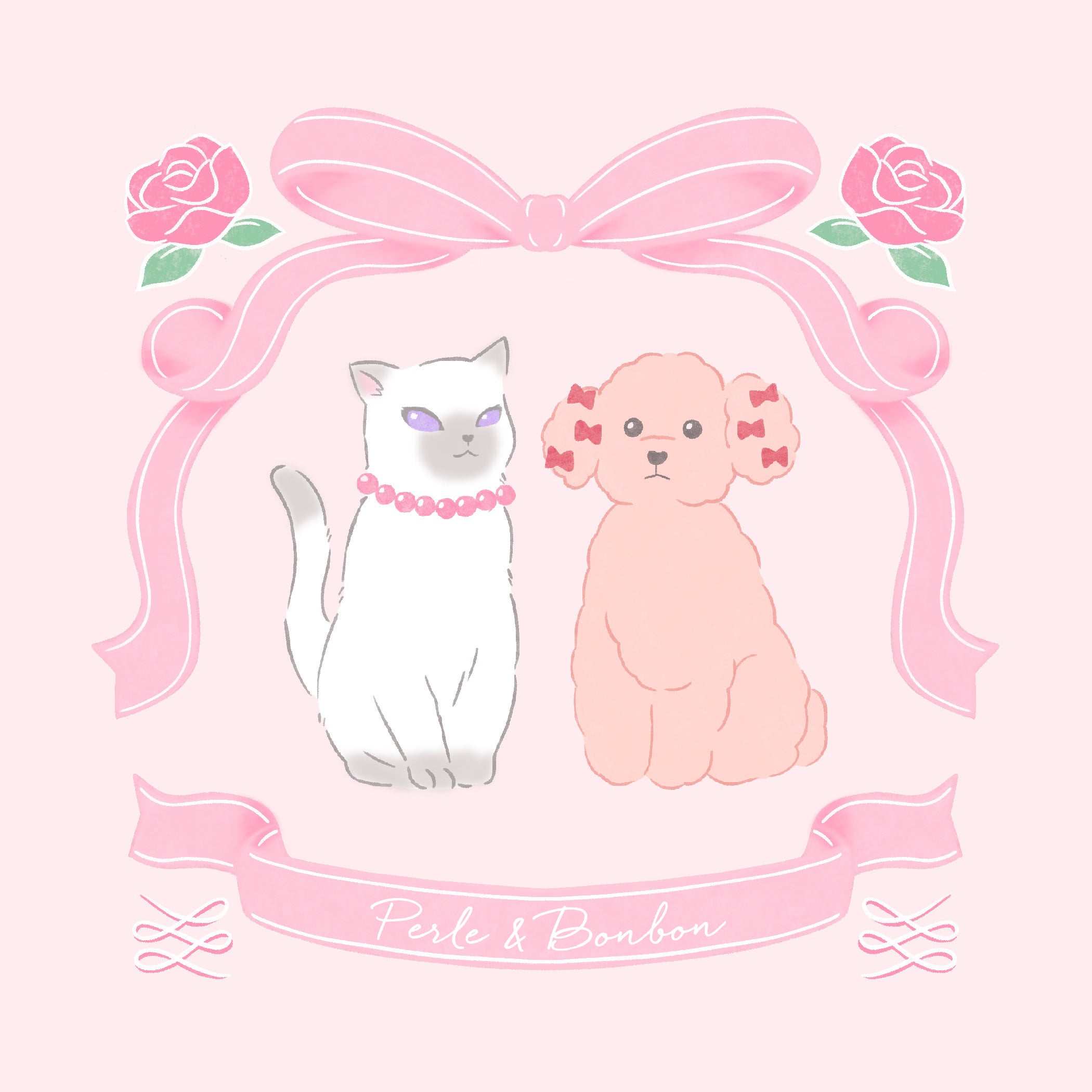 ペルルとボンボンについてしっかり者で、ちょっぴり気取り屋さんの猫のペルルと、優しくてのんびり屋さんの犬のボンボン。可愛いものやおしゃれが大好きなgriroseの仲間です。