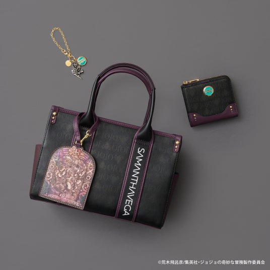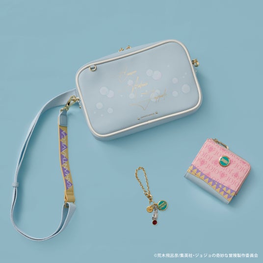 物語に登場する「ジョナサン・ジョースター」、「ディオ・ブランドー」、「ジョセフ・ジョースター」、「シーザー・A・ツェペリ」、「カーズ」の5キャラクターそれぞれをイメージしたバッグ、折財布、バッグチャームと、物語のキーアイテムでもある「石仮面」、「エイジャの赤石」をモチーフにしたバッグチャームの全17アイテムがラインナップ。
