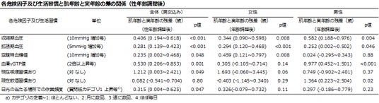 予防医療への関心の高まり本研究の結果は、肌年齢に生活習慣やその関連疾患、筋力が関連することを示したものです。肌の状態を保ち、「いつまでの若く健康でありたい」と願う方は、やはり日頃の生活習慣を見直す必要があるかもしれません。