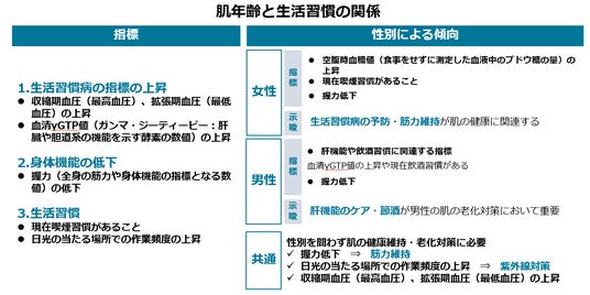 また、肌の老化に関連する要因は、性別によって異なる傾向が確認されました。