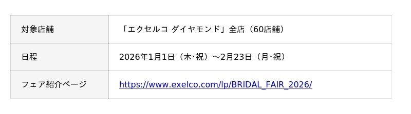 ▼BRIDAL FAIR(ブライダルフェア)詳細はこちら https://www.exelco.com/lp/BRIDAL_FAIR_2026/