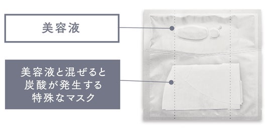 マスクは、1包タイプで美容液とマスクに分かれており、美容液がマスクに触れると炭酸が発生します。