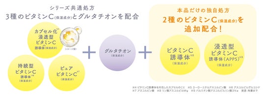 シリーズ共通の3種のビタミンC(カプセル化※4浸透型ビタミンC誘導体※5、持続型ビタミンC誘導体※6、ピュアビタミンC※7)とグルタチオン(保湿成分)を配合したグルタブライト処方に加え、ビタミンC誘導体※8、浸透型ビタミンC誘導体(APPS)※9の2種のビタミンCを追加配合。その他にも肌メンテうるおい成分としてアゼライン酸誘導体※10やナイアシンアミド、グリシルグリシン※11、2種のペプチド※12(すべて保湿成分)を配合しました。