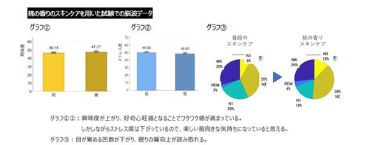 その結果、桃の香りが賦香されたスキンケアは、使用することで睡眠の質が向上し、前向きな気持ちになることを明らかにしました。さらにストレスが軽減されることも明らかになり、何かとストレスを感じやすい現代において、憂鬱になりがちな人、落ち込みやすい人、自分に自信を持てない人などの心をサポートすることが期待できます。