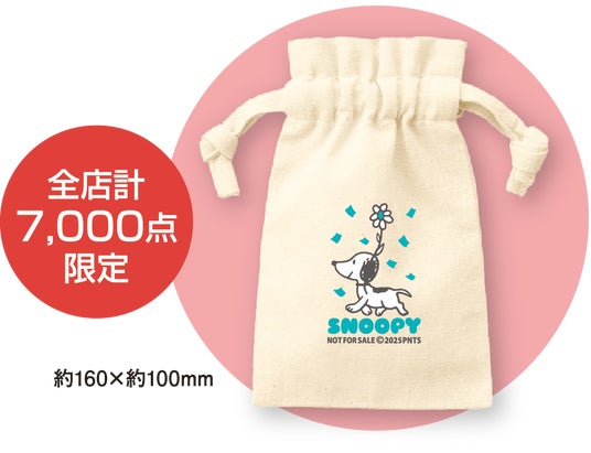 6月27日(金)から7月24日(木)までのフェア期間中、『スヌーピーフェア』掲載商品を含む3,300円(税込)以上ご購入いただいた方に「オリジナル ミニ巾着」をプレゼントいたします。