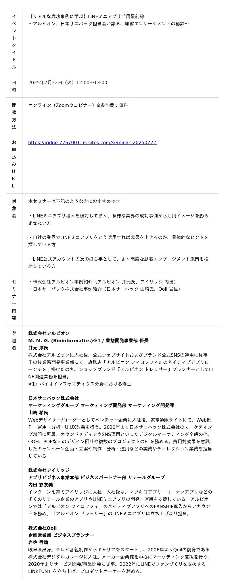 株式会社アイリッジ(本社:東京都港区、代表取締役社長:小田 健太郎、東京証券取引所グロース:3917、以下「アイリッジ」)と連結子会社でマーケティングに関するコミュニケーションデザイン事業を展開する株式会社Qoil(読み:コイル、本社:東京都港区、代表取締役社長:山下 紘史、以下「Qoil」)は、2025年7月22日にオンラインセミナー「【リアルな成功事例に学ぶ】LINEミニアプリ活用最前線 ~アルビオン、日本サニパック担当者が語る、顧客エンゲージメントの秘訣~」を開催することをお知らせします。