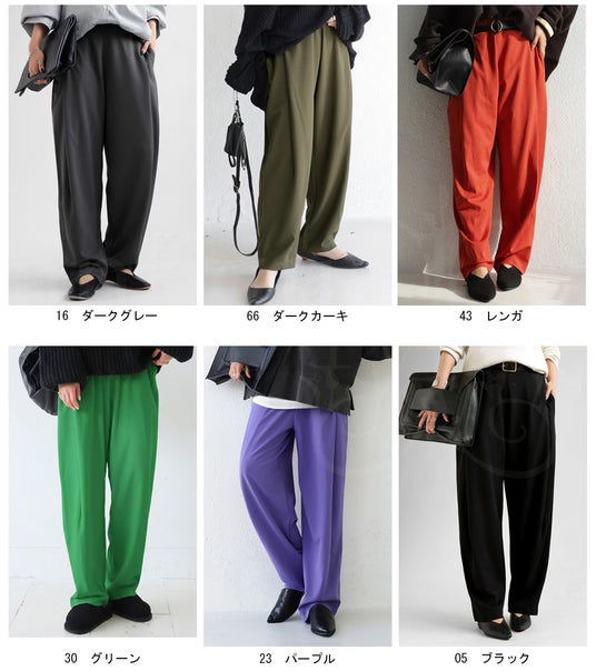 裾に向かって程よく細くなるシルエットがすっきりとした印象を与え、長めに入れたタックが縦ラインを強調し細見えをサポート。