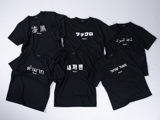 店頭にて税込25,000円以上お買い上げの方を対象に、日本・韓国・中国・アラビア・タイ・ヘブライの6つの言語で「真っ黒」とプリントされた「Macqlo world tee」をプレゼントいたします。