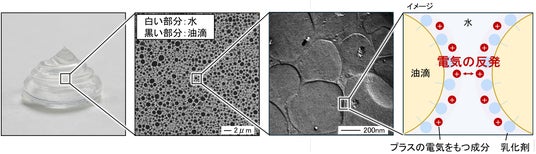 今回花王は、油滴同士がまとまって高内相比型エマルジョンが不安定になることを防ぐために、精密界面制御の知見から、同じ電気同士は反発するという性質を利用することを試みました。プラスの電気を持つ成分を水の中で油滴の表面部分にとどまるように工夫した結果、エマルジョンを安定化させることが可能になり、ベタつかない快適なオイルゲルをつくることに成功しました(図1)。