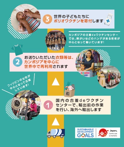 回収した衣料品は世界で販売され、1着売れると1人分のポリオワクチンが寄付されます。