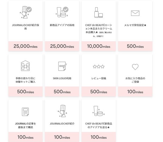 「CHEF de BEAUTE」の商品のお気に入り登録やメールマガジンの受信設定などECサイトや公式HPで様々なアクションを行うことでmilesを獲得いただけます。