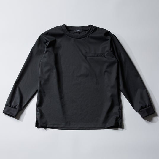 特徴:独自の新素材「ultimex」を使用した長袖Tシャツ。体のラインを拾いにくい、リラックス感のあるボックスシルエット。着脱を楽にする肩口ファスナーと、スマホがすっぽり入る胸ポケット付き。