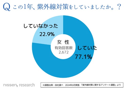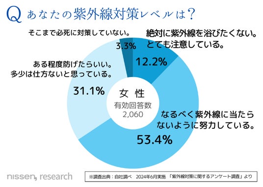 77%の女性が紫外線対策を実施していて、その対策度合は、「なるべく紫外線に当たらないように努力している」が53%と最も多い。そして、「絶対に紫外線を浴びたくない」は12%。このように、積極的に紫外線対策をしている女性は65%以上と、半数以上を占めており、女性の、紫外線対策への意識は高いといえる。