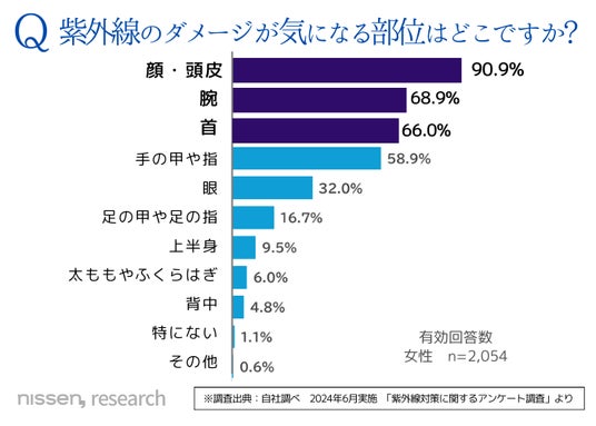 紫外線対策は7割以上の女性が意識している! 紫外線ダメージが気になる部位TOP5は、全て上半身でした。