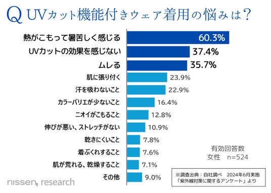 UVカット機能付きウェアを着用する際の悩みとしては、「熱がこもって暑苦しい」が6割以上と最も多い結果となりました。