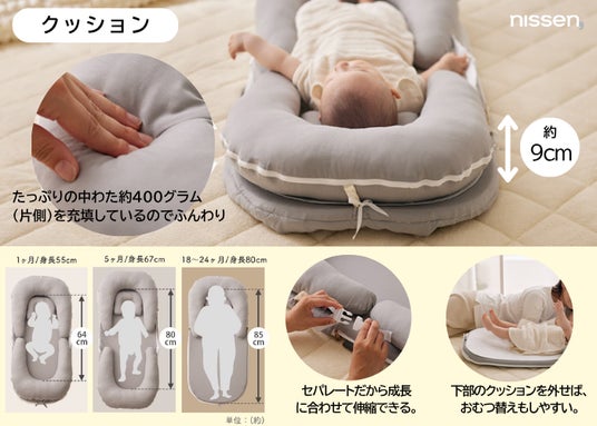 カバーは綿100%でやさしい肌あたり。クッションの中材を取り外してカバーだけでも手軽にお洗濯可能です。上下のクッションは赤ちゃんの成長に合わせて伸縮できるアジャスター付。約64~85cmまで調節可能なので、新生児から6ヶ月程度まで対応可能です。さらに、下部クッションを取り外して使えば2歳ごろまでご利用いただけます。