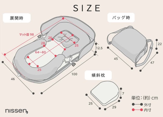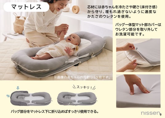 そのため仕様設計には、赤ちゃんの寝返りやうつ伏せ、吐き戻しへの不安に配慮しつつ、いつでも目の届く場所に設置ができるポータブルさを重視。折りたたんで、さっと持ち運びができることと、持ち運び用の収納袋紛失などがストレスにならないように、バッグ一体型のコンパクトな設計にしました。