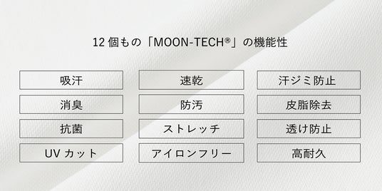 機能性一覧:汗ジミ防止、吸汗速乾、消臭、防汚、皮脂除去、抗菌、ストレッチ、透け防止、UVカット、速乾、防シワ、高耐久性。