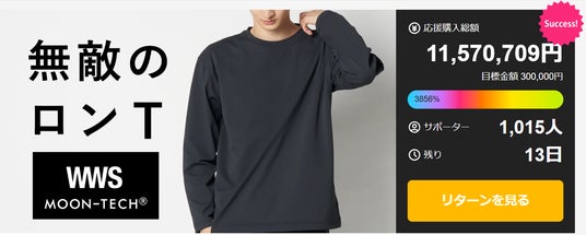 - 汗ジミ防止・消臭など機能搭載「無敵のロンT」をMOONRAKERSと共同開発。3日で800名を超える応援を頂き、Makuake応援総額1,000万円を突破!