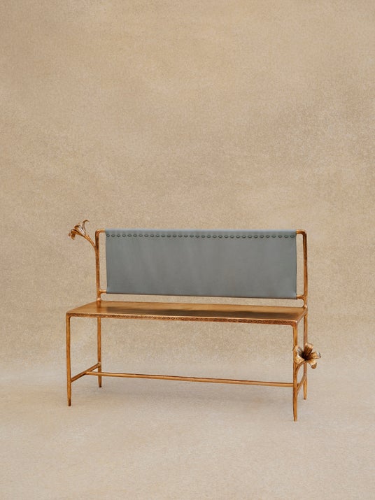 「フォンデリア フェンディ」による3D手彫りのユリと「セレリア」ステッチディテールがソリッドブロンズで施された3人掛けベンチ。フェンディの「クオイオ ローマ」レザーをアニーチェブルーで用い、それにマッチする「セレリア」レザーステッチのディテールを特徴としています。