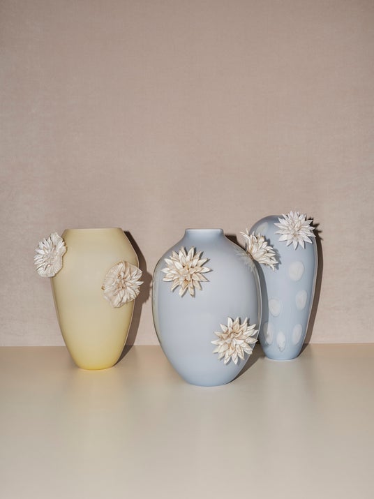 「バロヴィエ・エ・トーゾ」によるヴェネツィアのムラーノ(Murano)で手吹きされた、パステル調の不透明なアニーチェブルー、ソルベイエロー、クリーム色の3つの花瓶。彫刻された花柄のアップリケが特徴です。