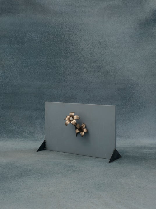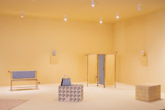 雄大なユリが咲き誇り、エレガントなブロンズ製のベンチ、オケージョナルチェア、ルームディバイダー、そして照明付き壁灯が配置されています。これらには、フェンディの象徴である「セレリア(Selleria)」ステッチのエンボス加工が施されており、インダストリアルクラフトと、職人の手仕事の間の境界線を曖昧にしています。デザインの着想源は、アールヌーボー、アールデコ、モダニズムといった様々なスタイルが交錯した「狂騒の20年代」です。作品にはフェンディのレザー職人の大胆な技が光り、「クオイオ ローマ(Cuoio Romano)」レザーを平面に貼り付け、メゾンのシグネチャーである「セレリア」ステッチで仕上げられています。また、モジュール式のベンチやキューブテーブルのシリーズは、特注のエンボス加工セラミックタイルで構成されており、手彫りの蘭の絵柄(タブロー)や、柔らかい色合いで釉薬をかけた「FF」モノグラムタイルが散りばめられたユリのモチーフが再現されています。ムラーノ(Murano)島の職人による口吹きの不透明なガラス花瓶は、コレクションの色彩や花柄モチーフを映し出しています。これらは、ヴァレッセの幻想的な花々をタイルのように表現したCC-タピス製の手作業で立体的に仕上げたウールラグとともに展示され、すべてが一体となって、コニー・ヴァレッセが思い描く豪華で装飾的なフェンディのサロン、360度に広がるその世界観を際立たせています。