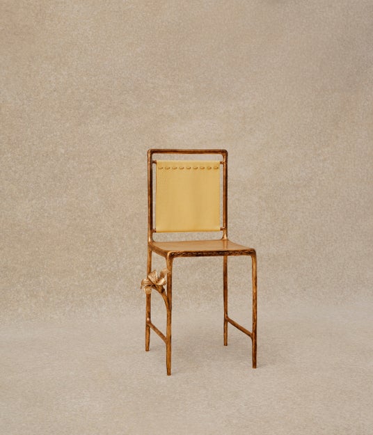 「フォンデリア フェンディ」による3D手彫りのユリと「セレリア」ステッチディテールがソリッドブロンズで施されたダイニングまたはオケージョナルチェア。フェンディの「クオイオ ローマ」レザーをソルベイエローで用い、それにマッチする「セレリア」レザーステッチディテールを特徴としています。