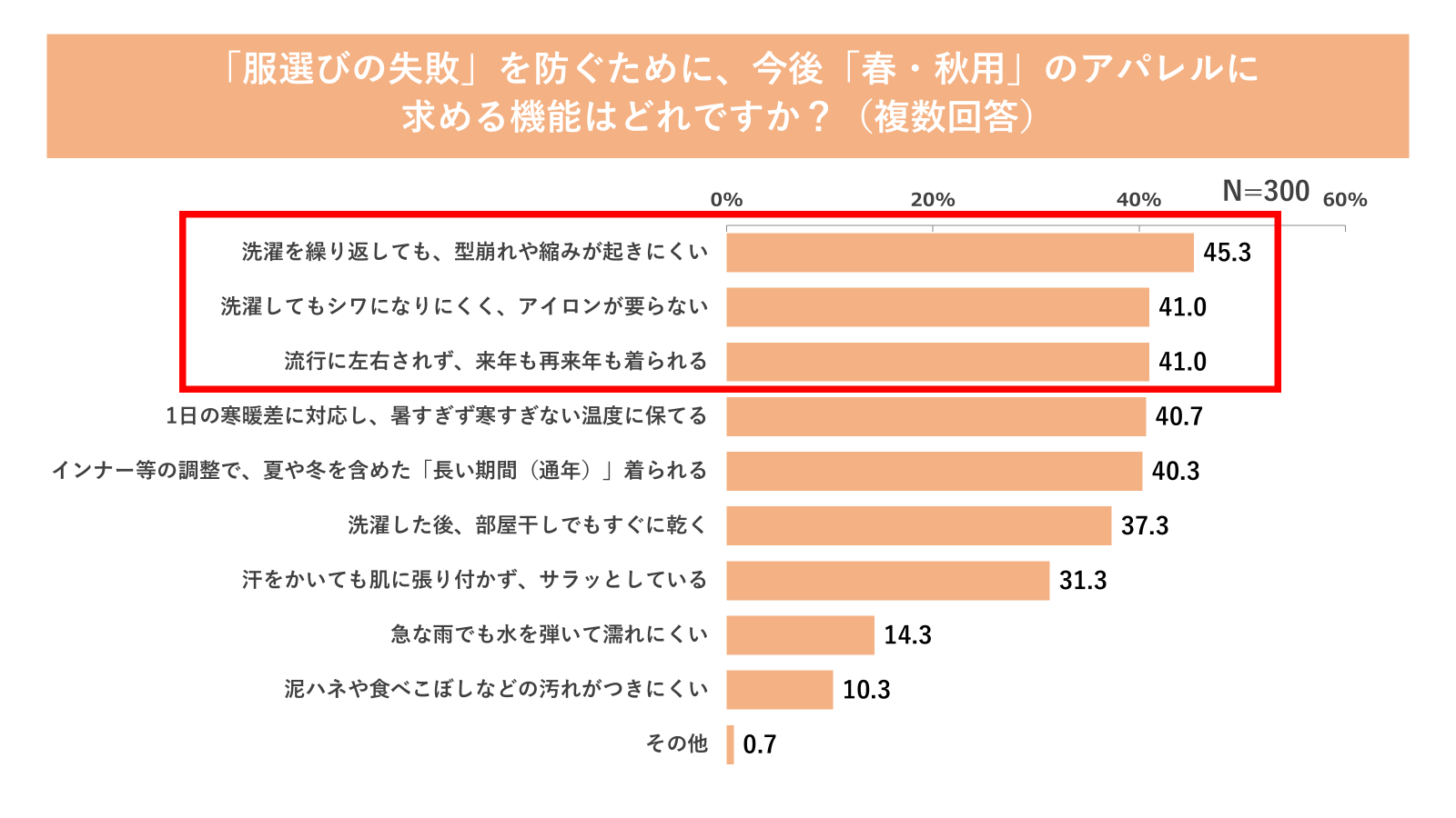さらに、今後「春・秋用」のアパレルに求める機能としては、「洗濯を繰り返しても型崩れや縮みが起きにくい(45.3%)」「洗濯してもシワになりにくく、アイロンが要らない(41.0%)」「流行に左右されず、来年も再来年も着られる(41.0%)」が高い割合を占めました(図6参照)。